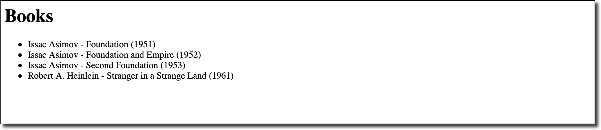 INSERT INTO books VALUES (4, 2, "Stranger in a Strange Land", 1961);