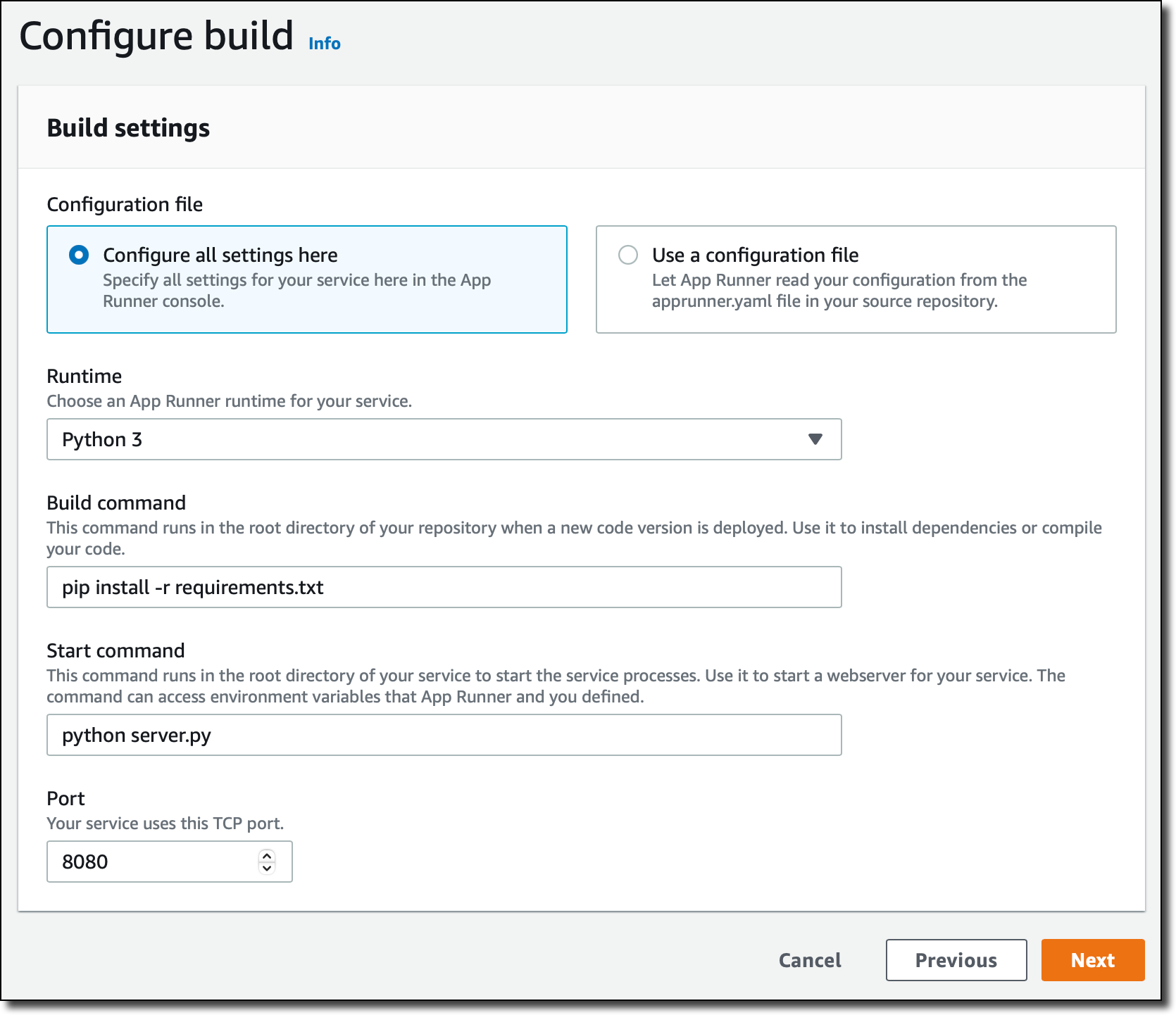 For more advanced use cases, I would add an apprunner.yaml configuration file to my repository as in this sample application.