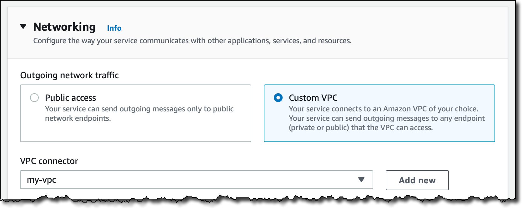 Within App Runner, you can now create VPC connectors that specify which VPC, subnets, and security groups to use for private networking. Once configured, you can use a VPC connector with one or more App Runner services.