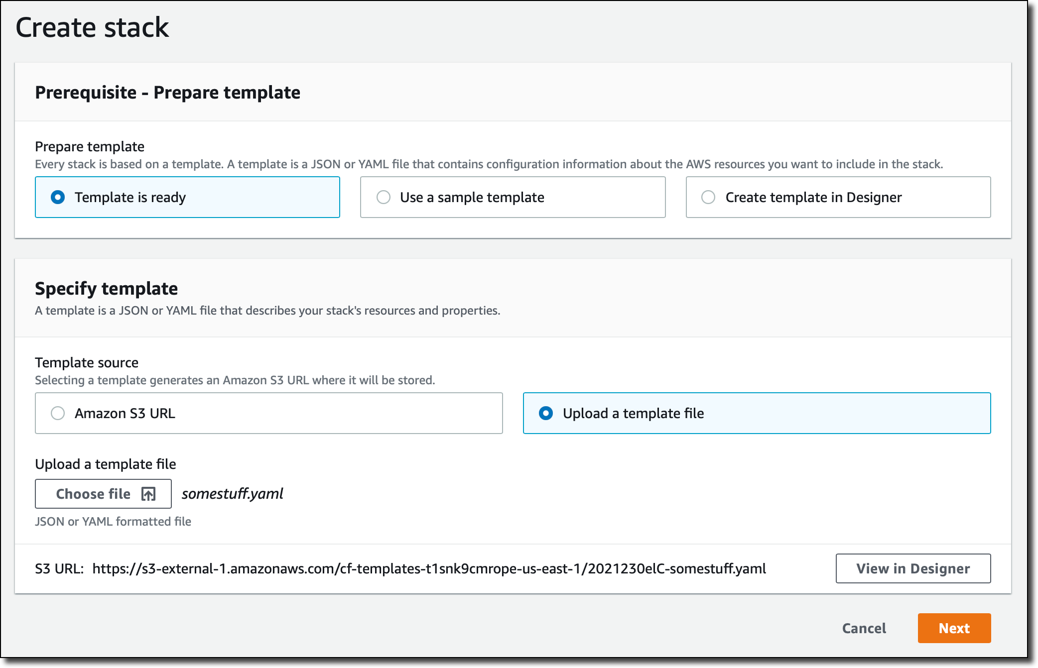 Now, I want to create a stack from this template. On the CloudFormation console, I choose Create stack. Then, I upload the template file and choose Next.