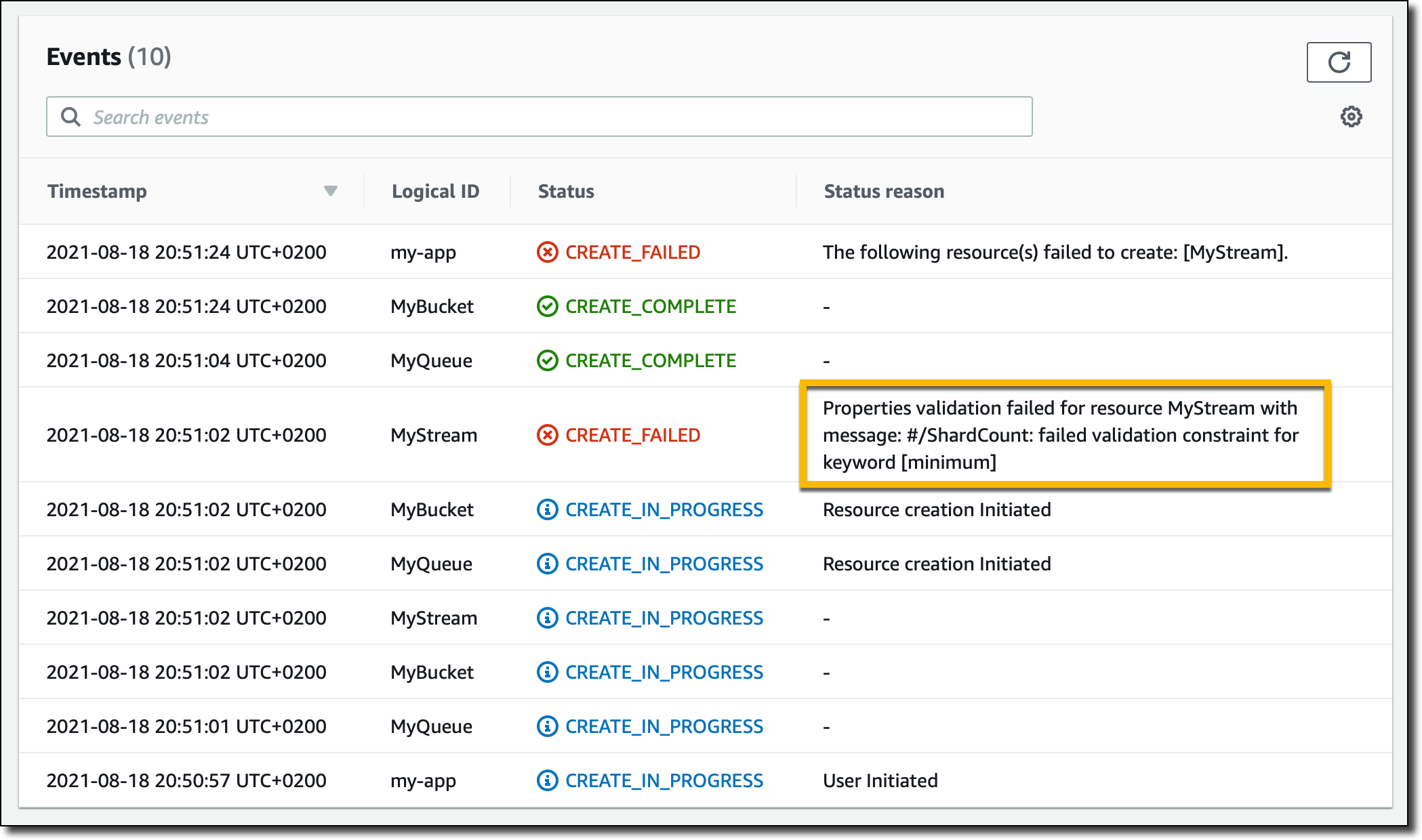 The creation of the stack is in progress for a few seconds, and then it fails because of an error. In the Events tab, I look at the timeline of the events. The start of the creation of the stack is at the bottom. The most recent event is at the top. Properties validation for the stream resource failed because the number of shards (ShardCount) is below the minimum. For this reason, the stack is now in the CREATE_FAILED status.