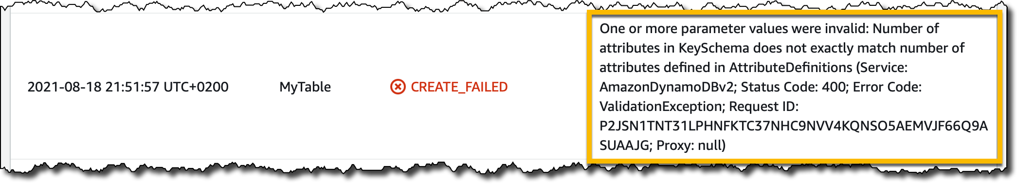 This time there is an error in my template where I define the DynamoDB table. In the AttributeDefinitions section, there is an attribute (TicketSales) that is not used in the schema.