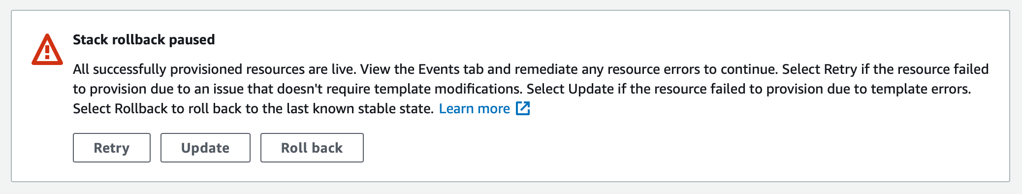Retry – To retry the stack operation without any change. This option is useful if a resource failed to provision due to an issue outside the template. I can fix the issue and then retry from the point of failure.