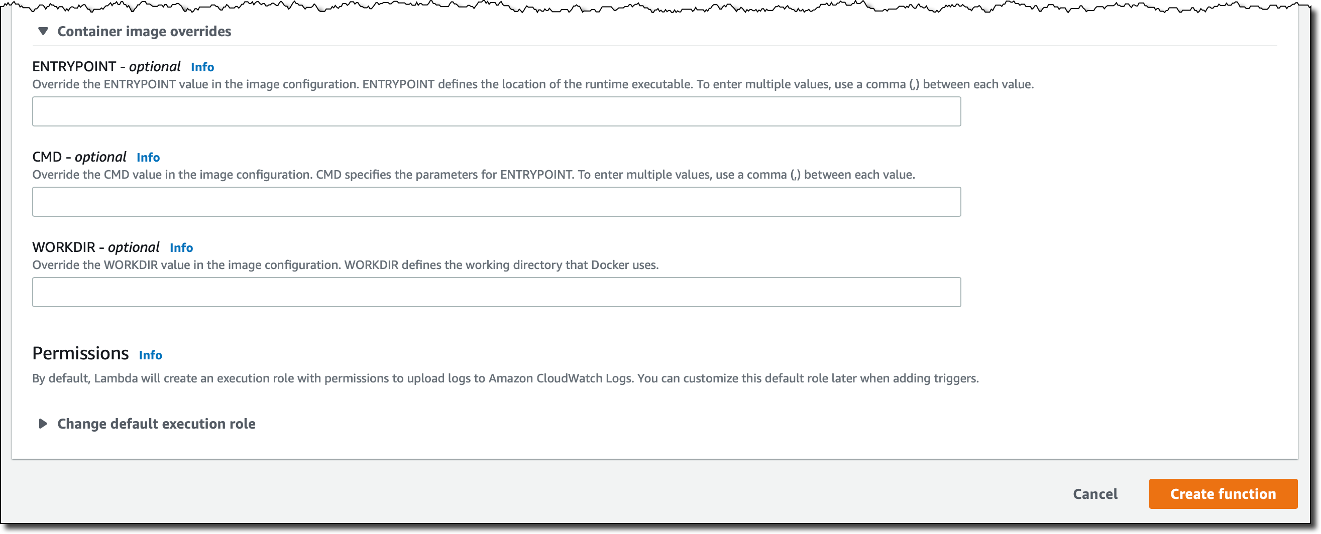 Optionally, I can override some of the container image values. I am not doing this now, but in this way I can create images that can be used for different functions, for example by overriding the function handler in the CMD value.