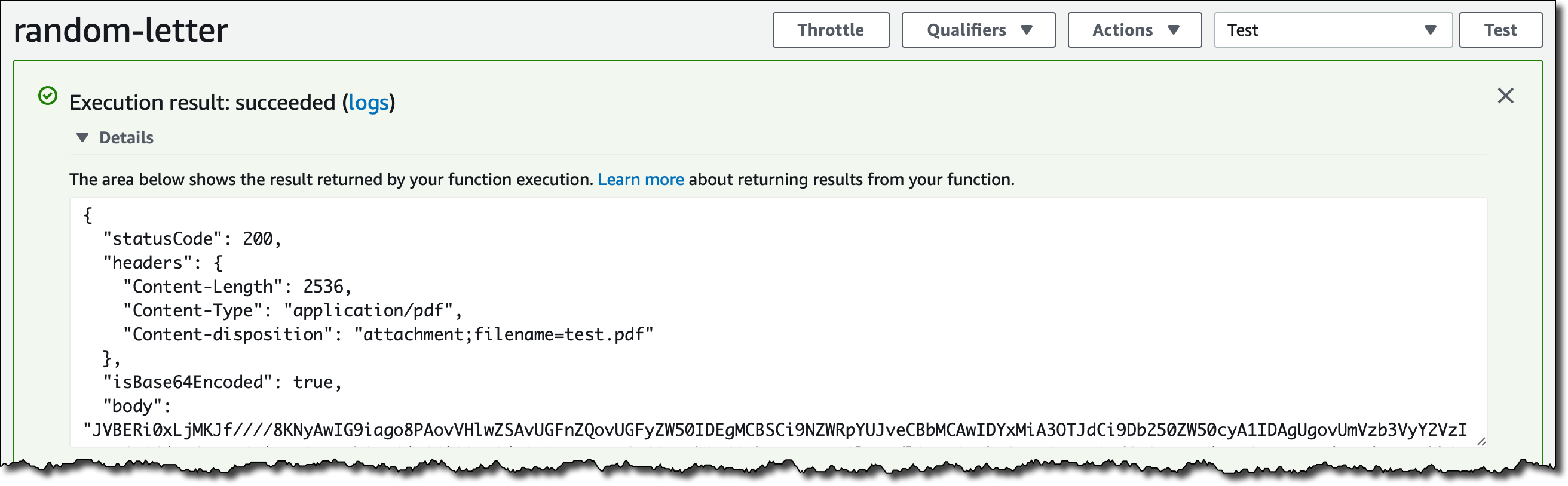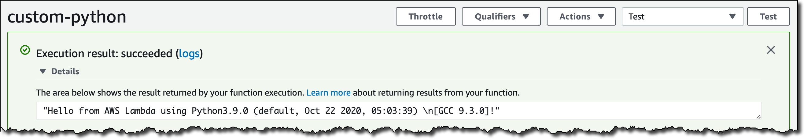 I push the image to ECR and create the function as before. Here's my test in the console: