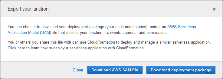 You can now generate AWS SAM files and deployment packages for your Lamba functions using a new Export operation in the Lambda Console. Simply click on the Actions menu and select Export function: