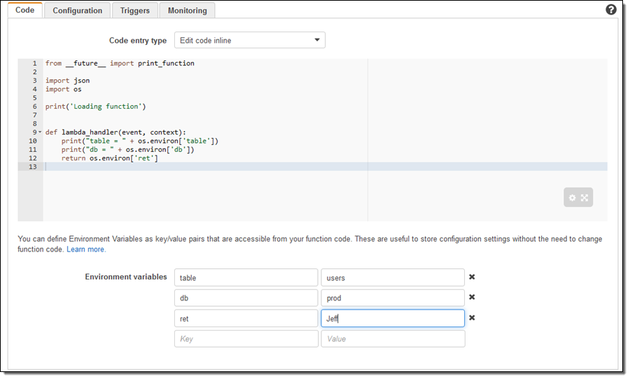 When you create a new version of a Lambda function, you also set the environment variables for that version of the function. You can modify the values for the latest version of the function, but not for older versions. Here’s how I would create a simple Python function, set some environment variables, and then reference them from my code (note that I had to import the os library):