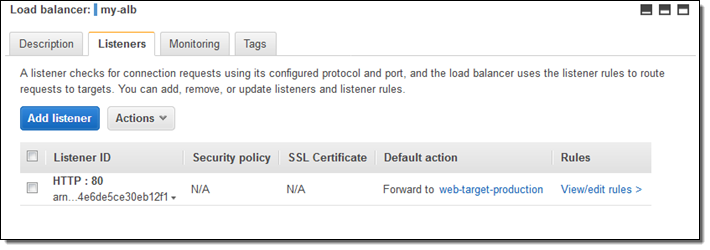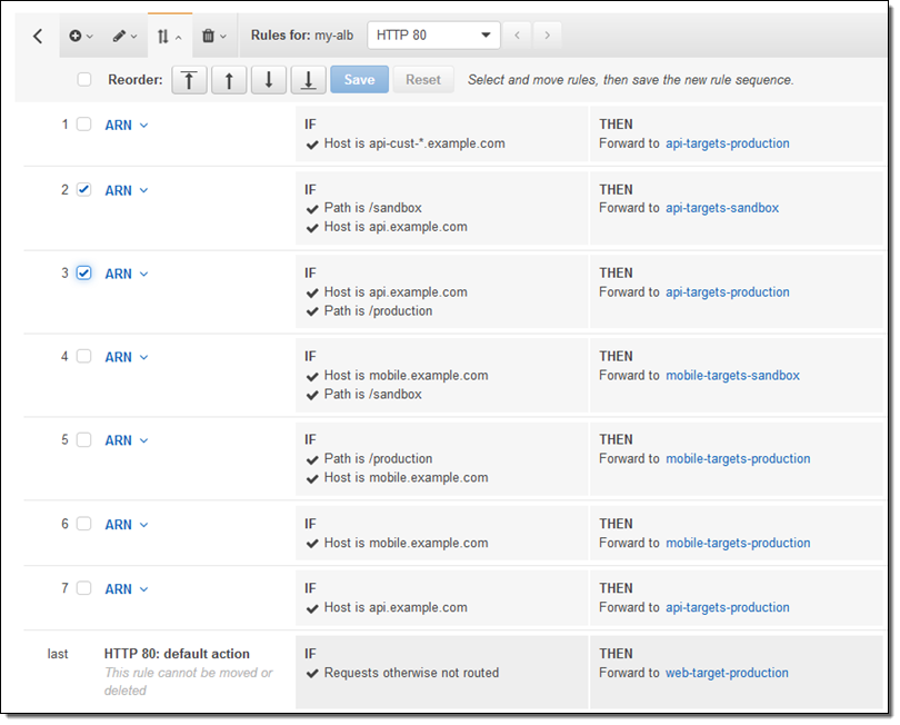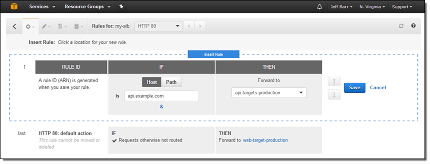 The Load Balancing Console shows the listeners that are associated with my Application Load Balancer: From there I simply click on View/edit rules to access the new rule editor: