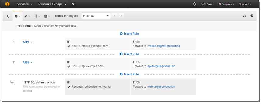 As part of today’s launch we are raising the maximum number of rules per Application Load Balancer from 10 to 75, and also introducing a new rule editor. I’ll start with the following target groups: