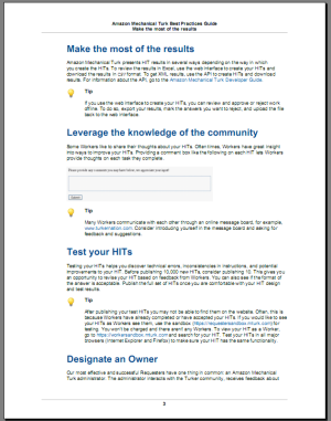 New and existing Mechanical Turk Requesters will find a lot of helpful information in the new Amazon Mechanical Turk Best Practices Guide. This 12-page document provides guidelines for planning, designing, and testing HITs. For example, it advises the use of a comment box on each HIT. This box gives Workers the ability to provide their thoughts on the tasks that they complete. The guide also recommends that Requester organizations designate a specific person as the Mechanical Turk administrator. This person can design the HITs, interact with the community, receive and respond to feedback, and process the results. There’s information about designing HITs and the associated instructions, setting an equitable reward for successful completion of a HIT, and lots more.