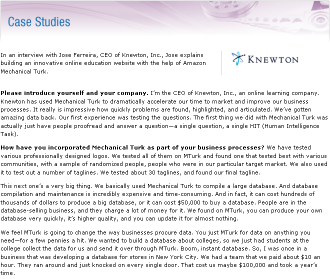 I just spent some time going through the case studies. There’s a lot of really good information and advice inside for anyone using or contemplating the use of Mechanical Turk.