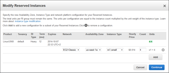 Today we are giving you the ability to change the instance type of your Linux/UNIX reservations. For example, you can change a reservation for four m1.small instances into a single reservation for an m1.large instance. With today’s launch you can take advantage of the pricing and capacity benefits of Reserved Instances even as you change from one EC2 instance type to another.