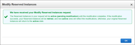 Once initiated, each of the modifications will succeed or fail within two hours. You will see the state of your existing Reserved Instances change, and you will see new Reserved Instances created as the modification proceeds: