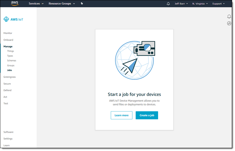 You can create and manage jobs from the AWS IoT Console, and can also build your own tools using the CLI and the API. I open the Console and click Create a job to get started: