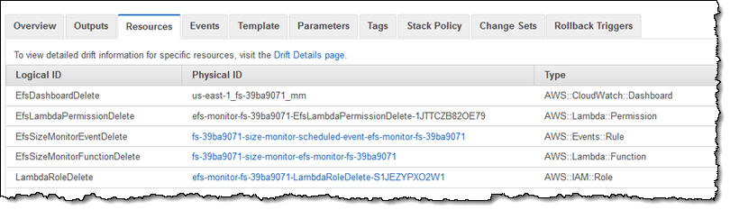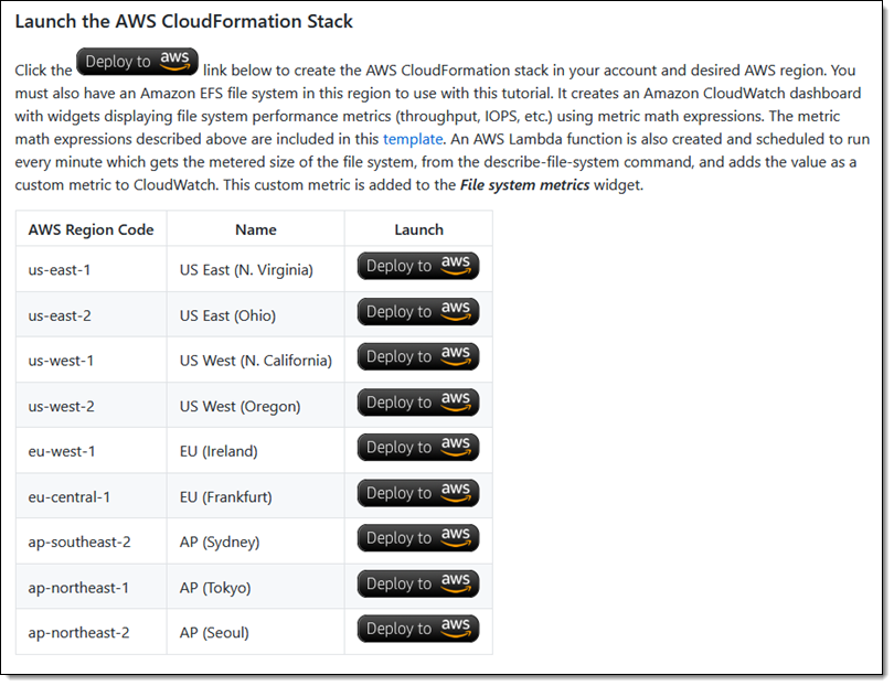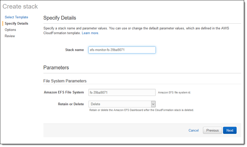 I select the desired template, enter the Id of my EFS file system, and click through the remaining screens to create my dashboard: