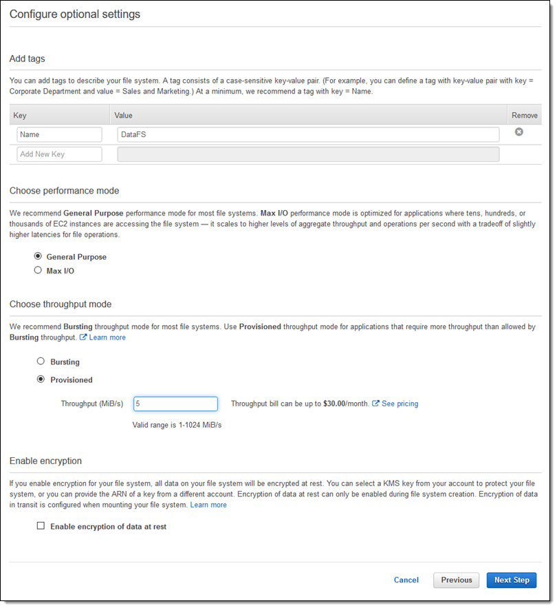 If your application has throughput requirements that exceed what is possible using the default (bursting) model, the provisioned model is for you! You can achieve the desired level of throughput as soon as you create the file system, regardless of how much or how little storage you consume.