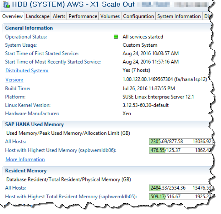 Here’s a screenshot from HANA Studio showing a large (14 TB) scale-out cluster running on seven X1 instances: