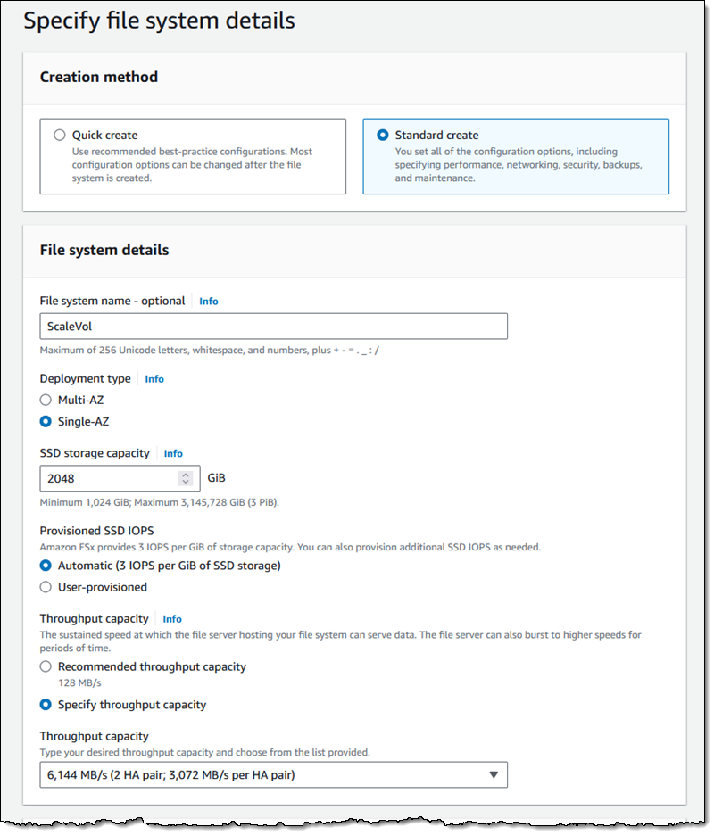 I choose Standard create, enter a name, select a Single-AZ deployment, and enter my desired SSD storage capacity. I can accepted the recommended throughput capacity, choose a value from the dropdown, or enter a value and see my options (more on that in a sec):