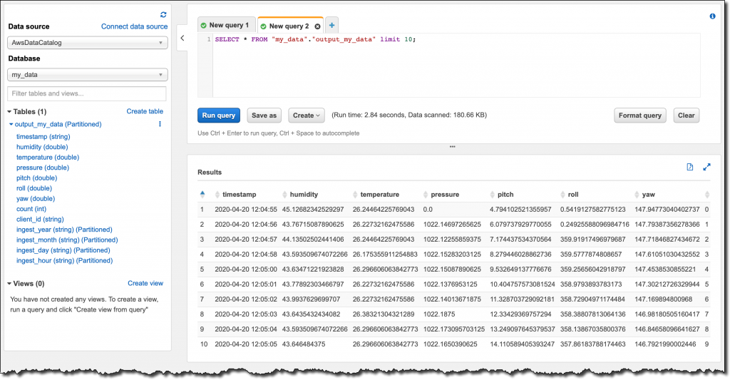 In the Amazon Athena console, I refresh database and tables, and select to preview the output_my_data containing ingest data from this year. In this way, I see the first ten records in the table, and get a confirmation that my setup is working!