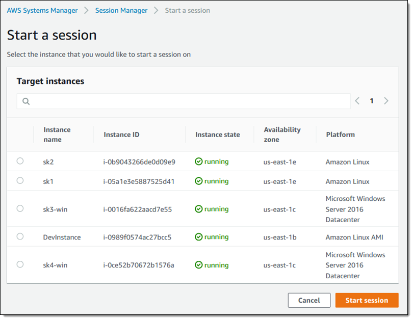 In order to use Session Manager to access my EC2 instances, the instances must be running the latest version (2.3.12 or above) of the SSM Agent. The instance role for the instances must reference a policy that allows access to the appropriate services; you can create your own or use AmazonSSMManagedInstanceCore. Here are my EC2 instances (sk1 and sk2 are running Amazon Linux; sk3-win and sk4-win are running Microsoft Windows):