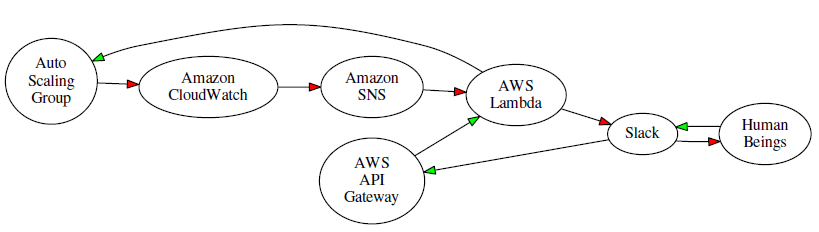 Suppose you want to monitor an Auto Scaling group using a CloudWatch alarm, and generate a message to your ChatOps team (a Slack channel) when a limit is exceeded. The team can take a closer look at the situation, and then decide to remedy the issue by scaling up. Using the new Slack integration and various AWS services, the overall flow would look like this (red arrows represent the notification; green arrows represent the response):