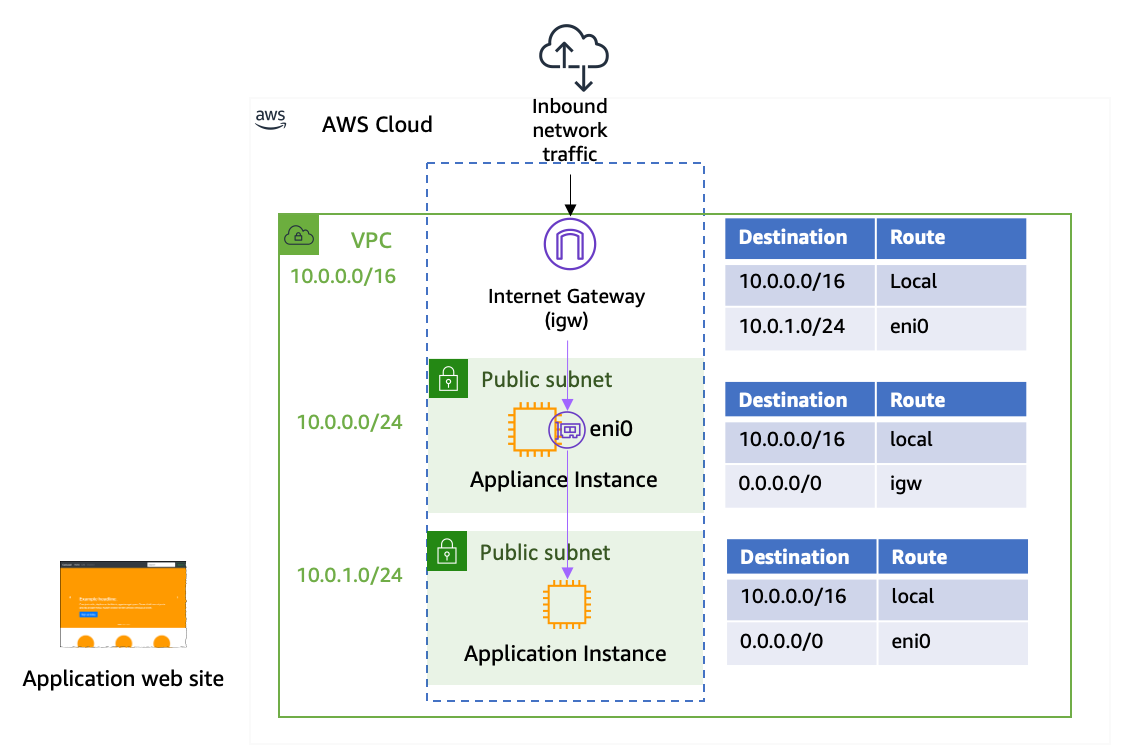 To route all application outgoing traffic through the appliance, I replace the default route for the application subnet to point to the appliance’s ENI: