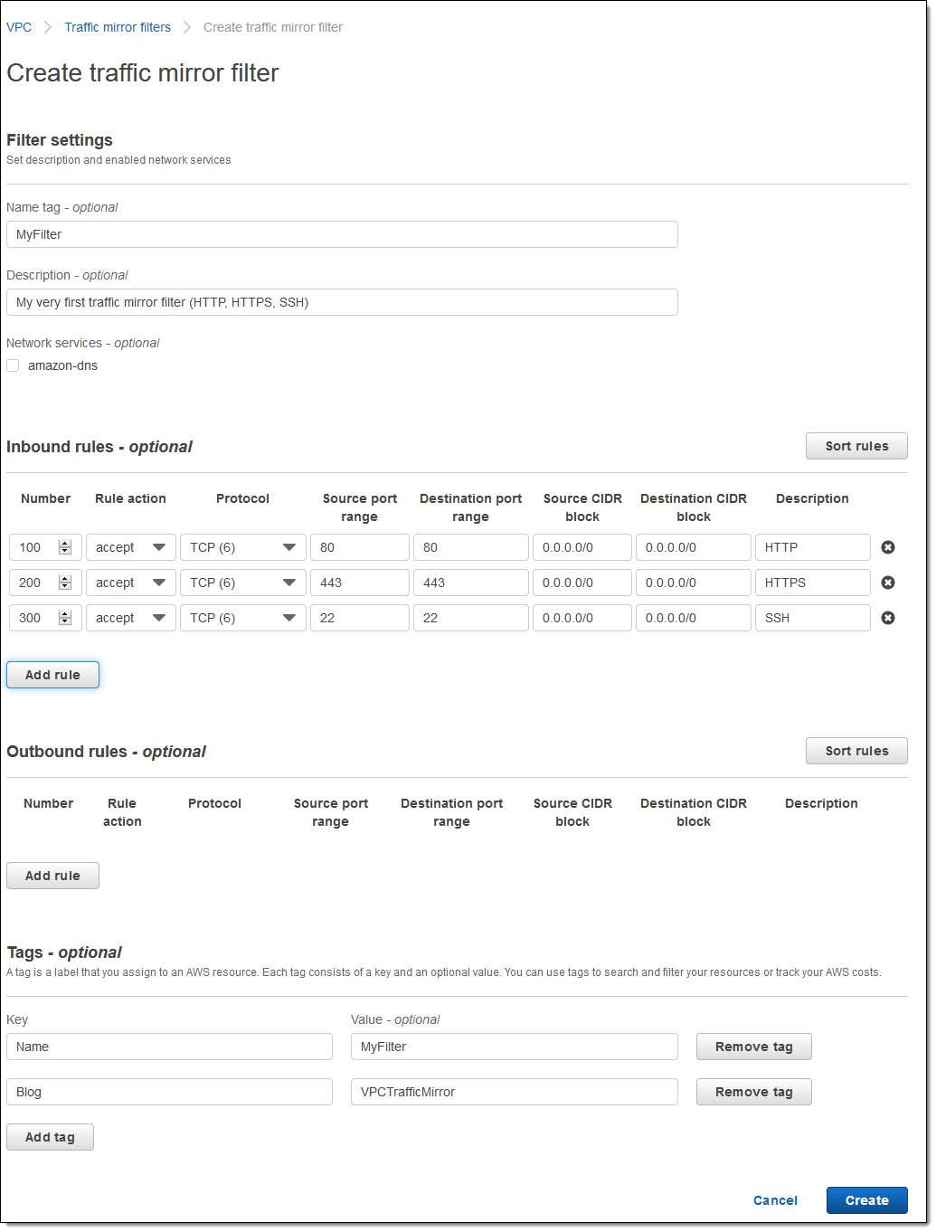 Now I click Mirror Filters and Create traffic mirror filter. I create a simple filter that captures inbound traffic on three ports (22, 80, and 443), and click Create:
