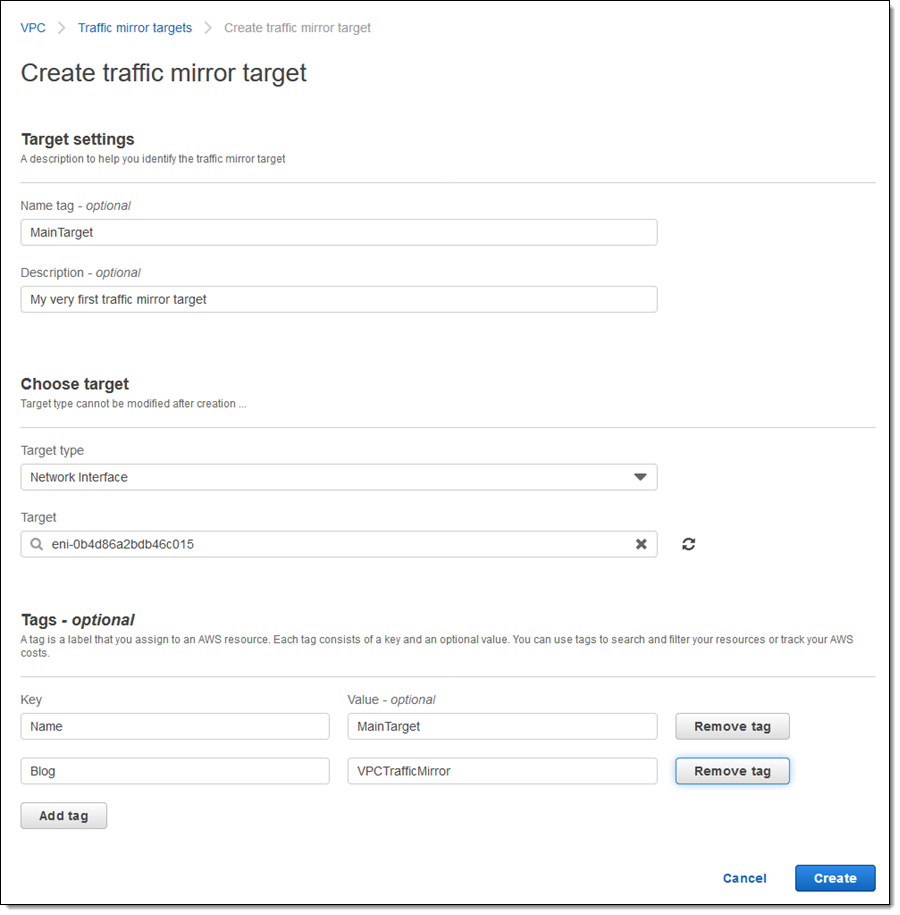 I enter a name and description, choose the Network Interface target type, and select my ENI from the menu. I add a Blog tag to my target, as is my practice, and click Create: