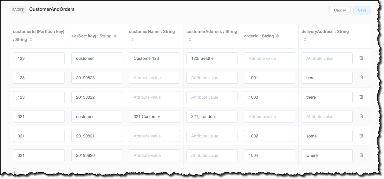 I am not adding a orderDate attribute, because for this data model the value will be stored in the sk sort key. For a real production use case, you would probably have much more attributes to describe your customers and orders, but I am trying to keep things simple enough here to show what you can do, without getting lost in details.