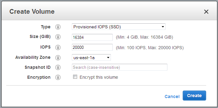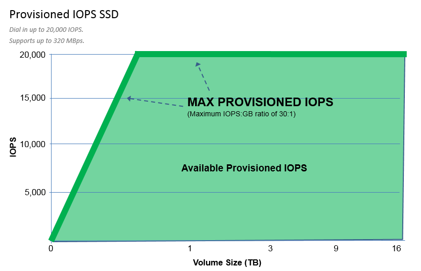Last year I told you about Larger and Faster EBS Volumes and asked you to stay tuned for availability. Starting today you can create Provisioned IOPS (SSD) volumes that store up to 16 TB (terabytes) and process up to 20,000 IOPS, with a maximum throughput of 320 MBps (megabytes per second). You can also create General Purpose (SSD) volumes that store up to 16 TB and process up to 10,000 IOPS with a maximum throughput of 160 MBps.