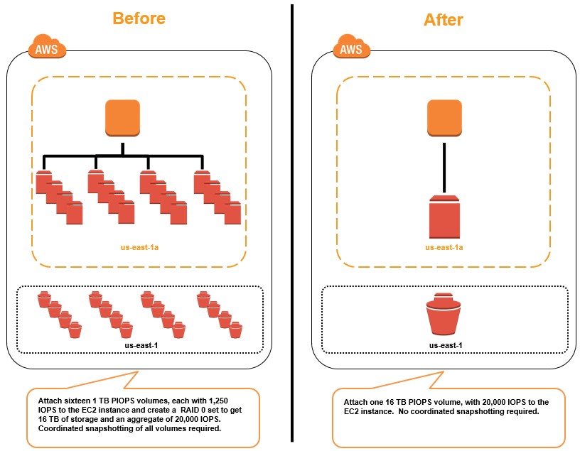 The following picture illustrates the reduction in complexity that is now possible. Instead of creating a RAID set composed of 16 EBS volumes (Before), you can now create a single, larger volume (After). This volume can host a 16 TB and 20,000 IOPS I/O-intensive transactional database requiring single digit millisecond latencies with consistent performance using Provisioned IOPS (SSD) on AWS: