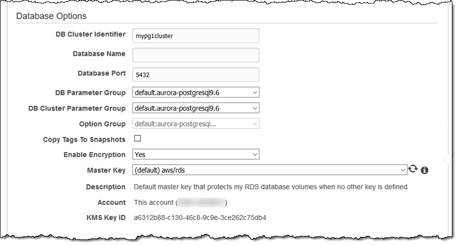 You can set the cluster name and other database options. Encryption is easy to use and enabled by default; you can use the built-in default master key or choose one of your own: