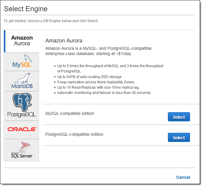 AWS Database Migration Service (AWS DMS) and the Schema Conversion Tool are ready to help you to move data stored in commercial and open-source databases to Amazon Aurora. The Schema Conversion Tool will perform a quick assessment of your database schemas and your code in order to help you to choose between MySQL and PostgreSQL. Our new, limited-time, Free DMS program allows you to use DMS and SCT to migrate to Aurora at no cost, with access to several types of DMS Instances for up to 6 months.