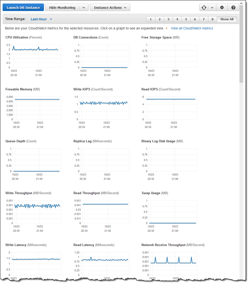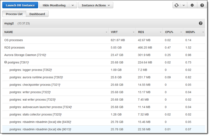 With enhanced monitoring enabled, each instance collects additional per-instance and per-process metrics. It can be enabled when the instance is launched, or afterward, via Modify Instance. Here are some of the metrics collected when enhanced monitoring is enabled: