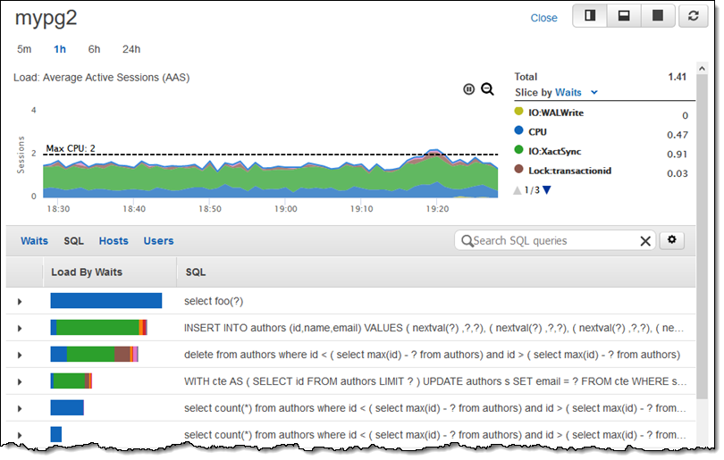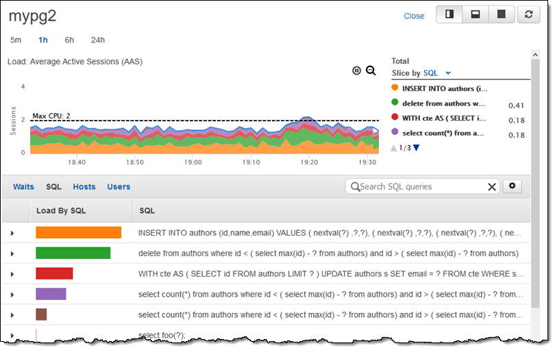As I noted earlier, Performance Insights is turned on automatically. This Amazon Aurora feature is wired directly into the database engine and allows you to look deep inside of each query, seeing the database resources that it uses and how they contribute to the overall response time. Here’s the initial view: