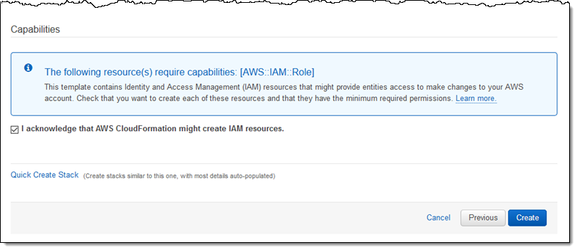 I review my settings, acknowledge that the stack might create IAM resources, and click Next to create the stack: