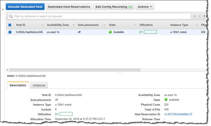 In anticipation of today’s launch, the EC2 team provisioned a u-12tb1.metal instance for my AWS account and I located it in the Dedicated Hosts section of the EC2 Console: