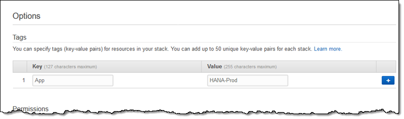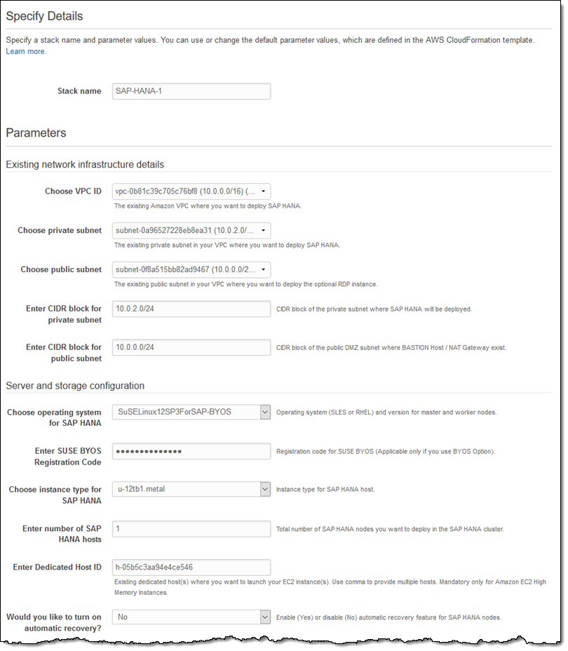 Following the directions in the SAP HANA on AWS Quick Start, I copy the Host Reservation ID, hop over to the CloudFormation Console and click Create Stack to get started. I choose my template, give my stack a name, and enter all of the necessary parameters, including the ID that I copied, and click Next to proceed: