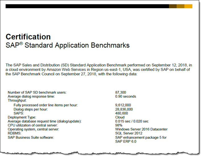 We ran the SAP Standard Application Benchmark and measured the instances at 480,600 SAPS, making them suitable for very large workloads. Here’s an excerpt from the benchmark: