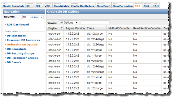 We have also added a new feature to the console that will make it easier for you to see the range of options available to you when you use RDS. Just click on Orderable DB Options to see which database engines, versions, instance classes, and options are available to you in each Region and Availability Zone: