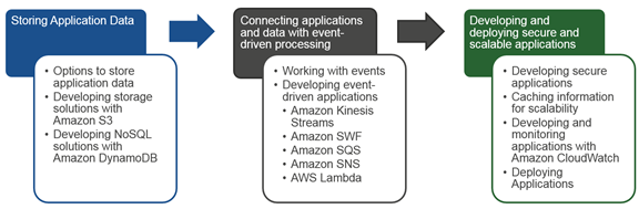 - Balance of Concepts and Code – The updated course expands coverage of key concepts, best practices, and troubleshooting tips for AWS services to help students build a mental model before diving into code. Students then use an AWS SDK to develop apps that apply these concepts in hands-on labs.