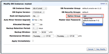 Select your option group from the drop down and decide if you would like your change to take effect immediately, or during your maintenance window: