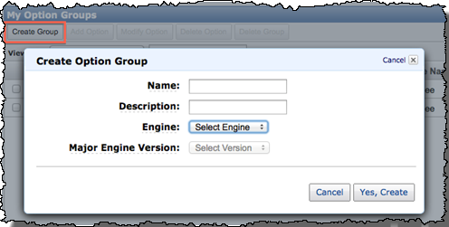 Next, from the Option Groups Screen, Select Create Group, fill in the fields, and then click Yes, Create.