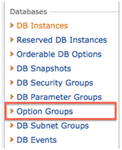 First, select Option Groups from the AWS Management Console Navigation Links.
