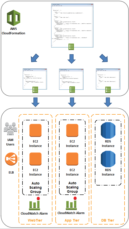 Lets look at an example. A three-tier application is defined in a top-level template that has web tier, app tier, and database tier as nested stacks. Using CloudFormation, the top level stack and the nested stacks are created together and in the correct order. After the stacks are created, we want to add a new IAM user to the top-level stack and CloudWatch alarms to the web tier and the app tier. With the introduction of nested stack updates, we can update the top level stack, the web tier stack, and the app tier stack together and in the correct order. The stack for the database tier, which has no changes, would not be updated. Before introduction of nested stack updates, we would have had to update each of the nested stacks individually.