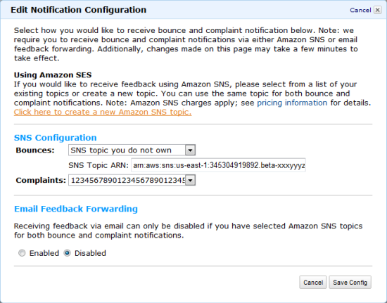 Today, we are giving you a mechanism to simplify that process. You can now arrange for SES to notify you of bounces and complaints by sending JSON-formatted messages to the SNS (Simple Notification Service) topics of your choice.