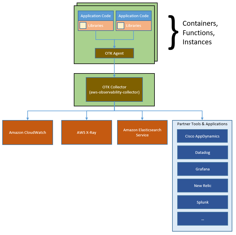 The AWS Observability Collector runs within your environment. It can be launched as a sidecar or daemonset for EKS, a sidecar for ECS, or an agent on EC2. You configure the metrics and traces that you want to collect, and also which AWS services to forward them to. You can set up a central account for monitoring complex multi-account applications, and you can also control the sampling rate (what percentage of the raw data is forwarded and ultimately stored).