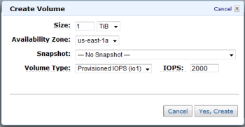 Time moves fast on the AWS team, and I’m happy to announce that you can now provision up to 2,000 IOPS per EBS volume (double the previous limit of 1000). This is an order of magnitude more IOPS than you can expect from a high-end 15,000 RPM disk drive. If you’ve been RAIDing multiple volumes together for even higher performance, you may be able to achieve the desired level of performance with far fewer volumes.