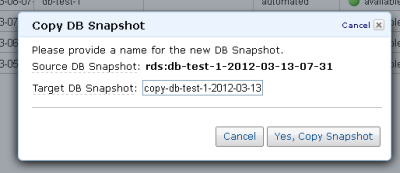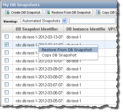 Based on feedback from customers, RDS recently made the automated backups of your DB Instances available for copy or restore. The snapshots are visible within the Console. You can create a new DB Instance from any of your snapshots by simply right-clicking and choosing the Restore From DB Snapshot command: