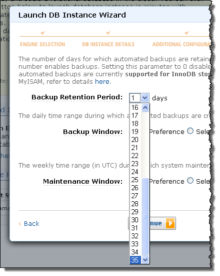 After fielding a number of customer requests, we have increased the maximum retention period from 8 days to 35 days. A number of our customers have asked for this new limit in order to retain at least one month’s worth of backups for compliance purposes.
